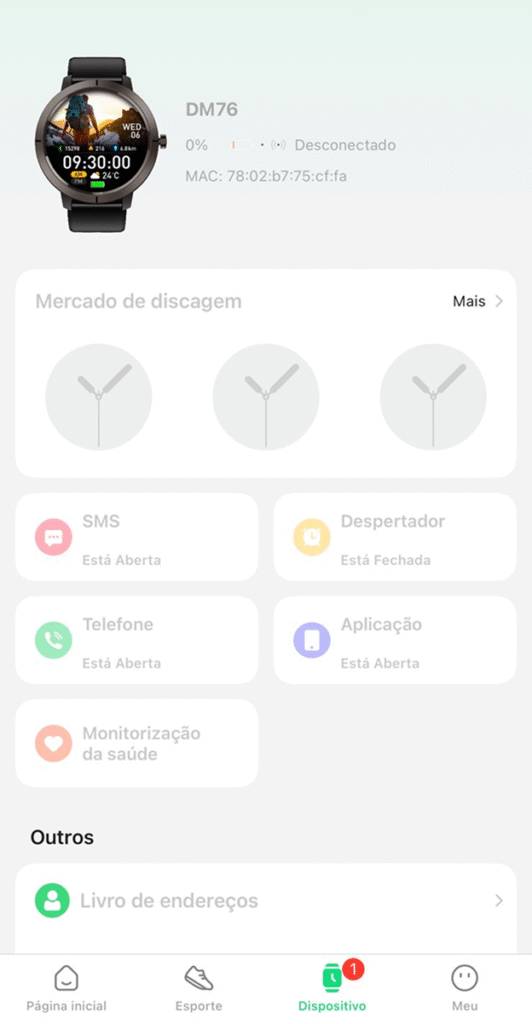 Permite emparelhar o smartwatch com o app via Bluetooth e sincronizar dados de forma eficiente. O app salva automaticamente o endereço Bluetooth do relógio e busca conexão sempre que o app é aberto ou executado em segundo plano.